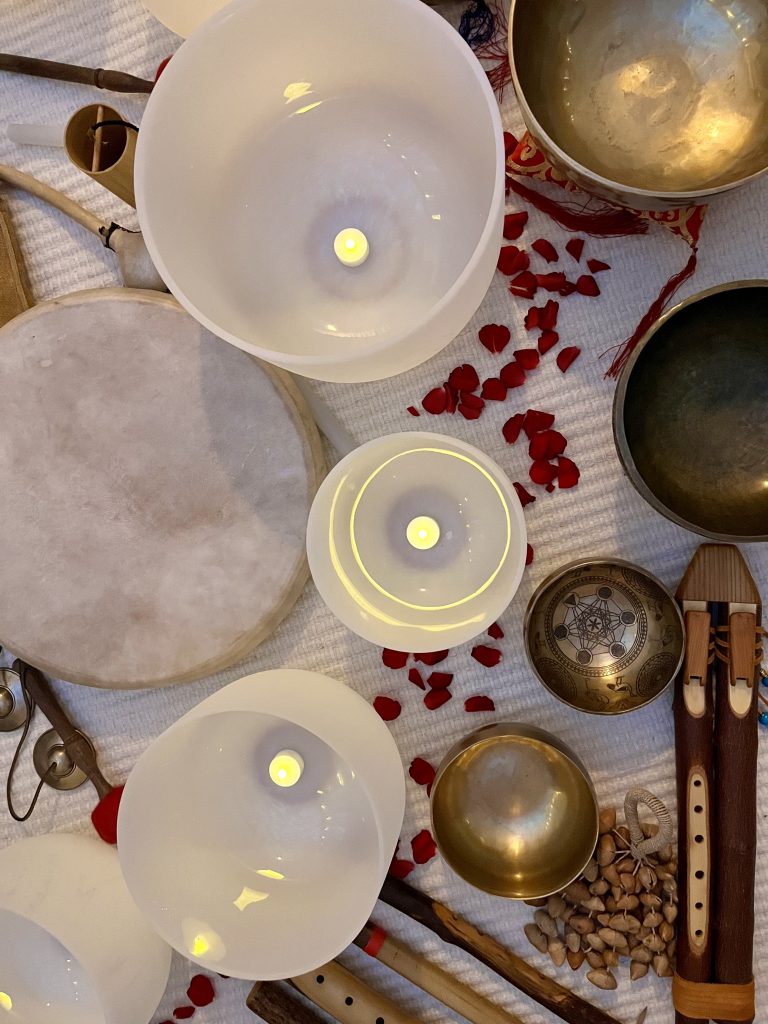 In sound healing, a wide variety of instruments may be used: Tibetan singing bowls, gongs, crystal bowls, shaman drums, rattles, flutes, didgeridoos, chimes, tingshas, rainsticks, wind chimes, and more. The voice is one of the most powerful tools—both the facilitator’s and the participant’s own voice carry immense healing potential.
